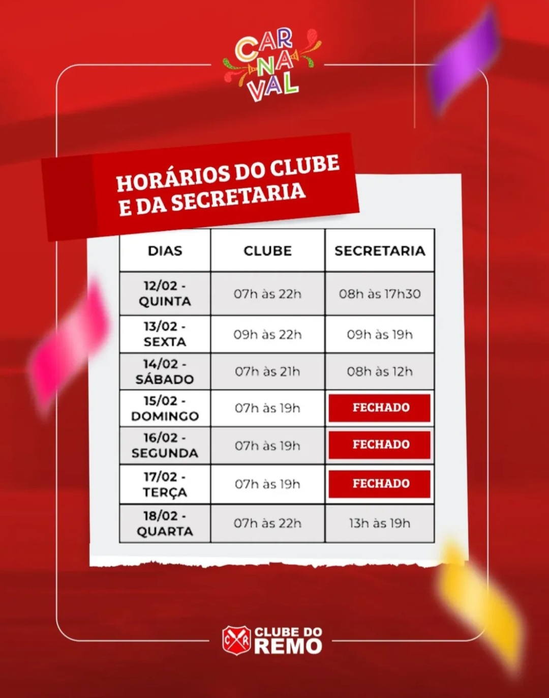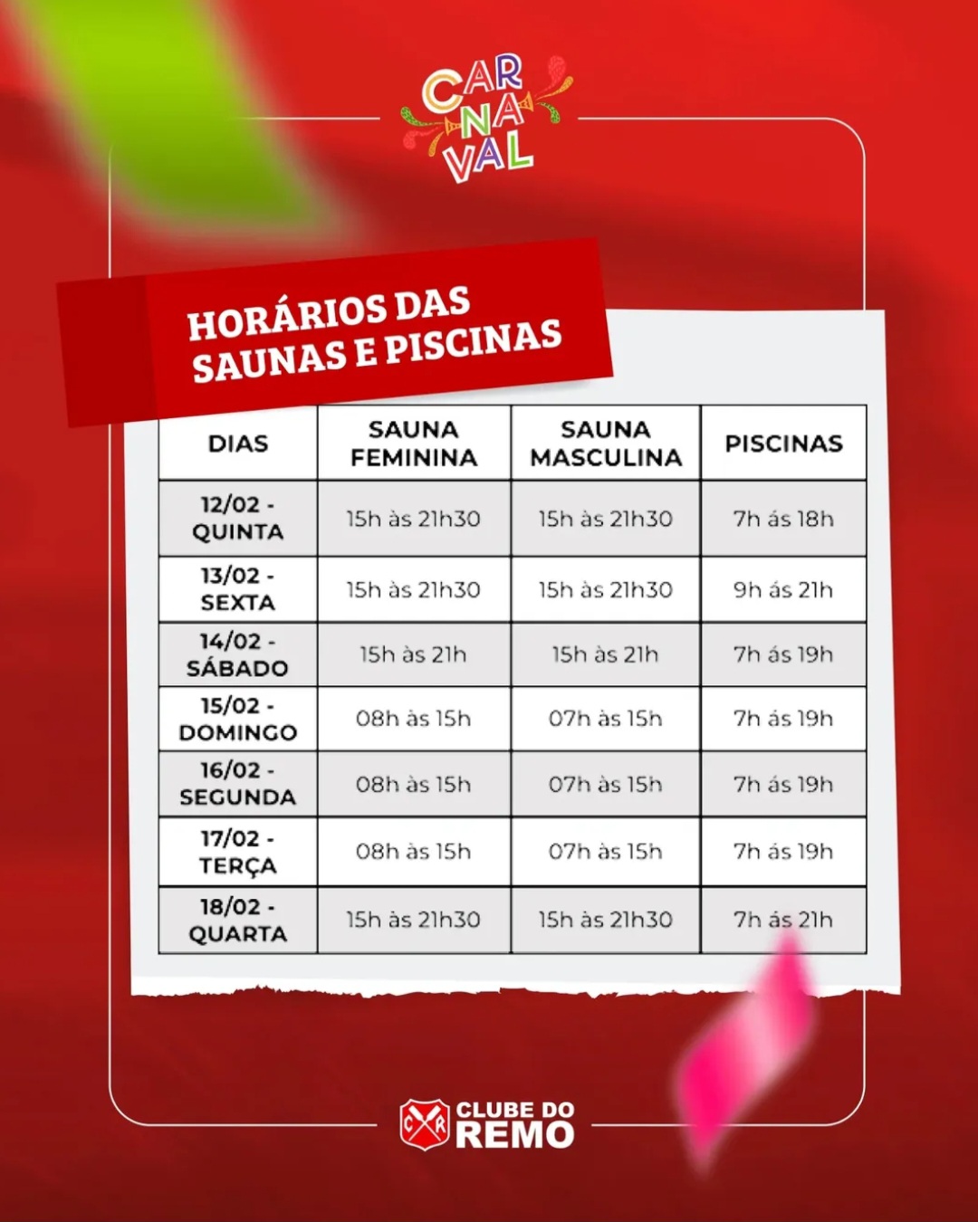 HORÃRIOS DO CLUBE NO CARNAVAL